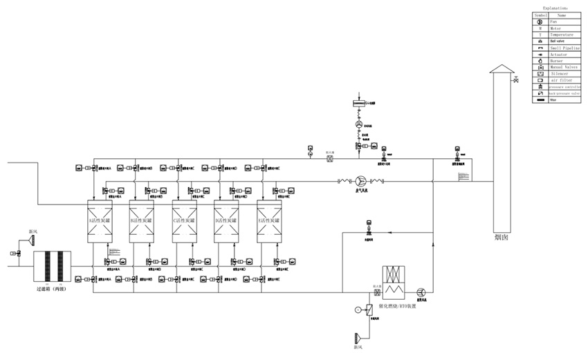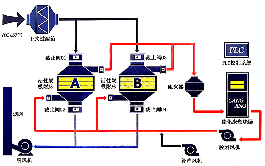 本凈化裝置采用雙氣路連續(xù)工作,設兩個或多個吸附床可交替使用,先將有機廢氣用活性炭吸附,當快達到飽和時停止吸附操作,然后用熱氣流將有機物從活性炭上脫附下來使活性炭再生;脫附下來的有機物已被濃縮并送入催化燃燒室轉化成CO2和H2O排出,當有機廢氣濃度合適的情況下,有機廢氣可維持自燃,不用外加熱,燃燒后的尾氣一部分排入大氣,大部分送往吸附床,用于活性炭的脫附再生。這樣能滿足燃燒和脫附所需的熱能,達到節(jié)能的目的,再生后的活性炭也可用于下次吸附。裝置既適合于連續(xù)操作,也適合于間斷操作。